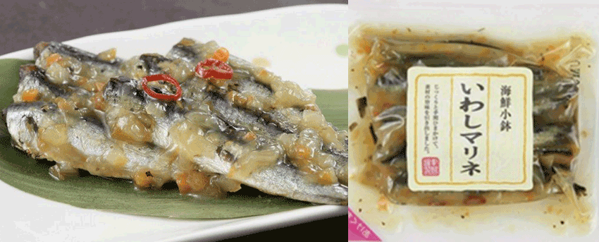 原材料:いわし(銚子沖)、たまねぎ、ぶどう酢、人参、砂糖、醤油(大豆・小麦を含む)、還元水飴、香味油(たまねぎ)、食塩、醸造酢、澱粉、おろしにんにく、かつお節エキス、胡椒、唐辛子/調味料(アミノ酸等)、酸味料