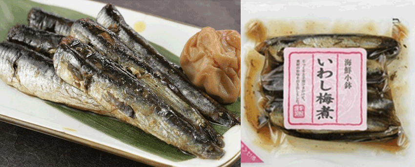 原材料:いわし(銚子沖)、砂糖、醤油(大豆・小麦を含む)、還元水飴、みりん、醸造酢、梅肉、梅酢、かつお節エキス、魚醤、でん粉、酵母エキス/酸味料