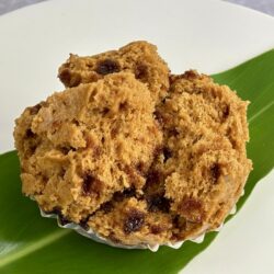 具志堅商店の「黒糖アガラサー」は、小麦粉とふくらし粉(重曹)、黒糖を溶かした液をざっくり混ぜ、蒸して作っています。とってもシンプルだけれど、最高のおやつの出来上がり♪